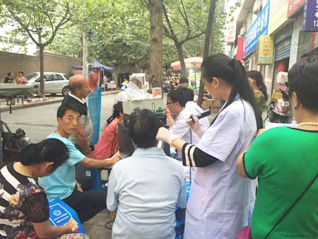 义诊紧张而有序的开始了,中大医护人员仔细为幸福小区居民测血压、做耳鼻喉健康检查,耐心回答每一位居民提出的疑难问题。提供义务咨询、测量血压、咨询、就诊等服务,并针对耳鼻喉常见病、多发病等疾病的健康知识进行详细讲解。及时发现幸福小区居民的潜在病情,为幸福小区社区居民提供最便捷的就医指南,太阳早早的都落山了,整个义诊活动仍在持续进行着。